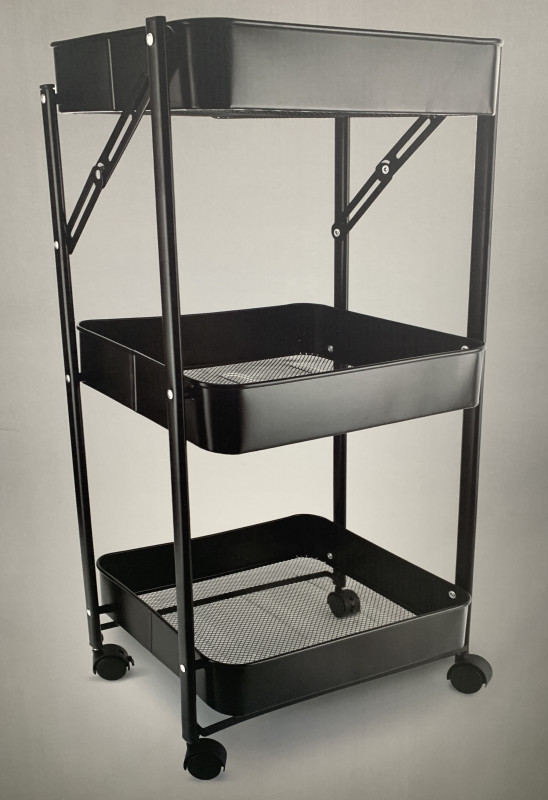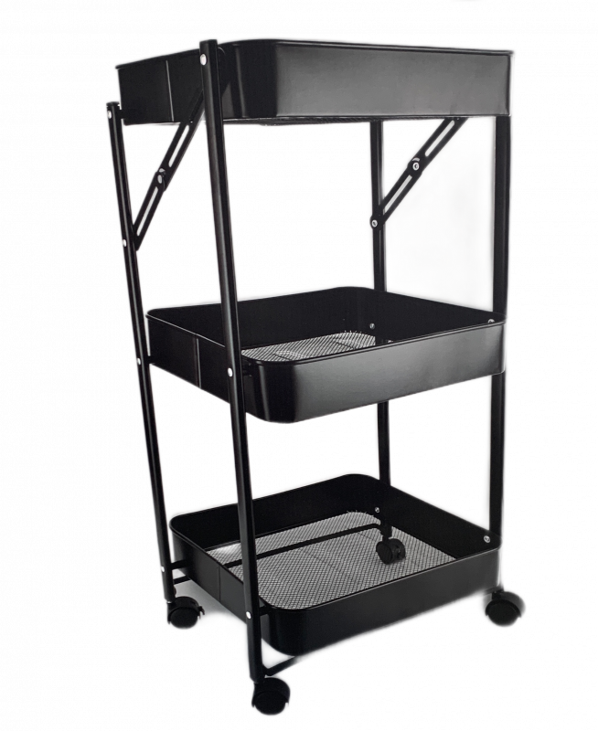 Этажерка складная на колесиках, 73х29,5х45 см – напольное или навесное изделие мебели, разновидность стеллажа, полки которого открыты со всех сторон и опираются на вертикальные стойки. У этажерок отсутствуют фасад и стенки. Универсальная мебель для каждого дома. Состав: нержавеющая сталь марки 235, полипропилен. Размер в упаковке: 27.5x55x40 см. Назначение: Для хранения. Материал: Нержавеющая сталь марки 235, полипропилен. Цвет: Черный. Размер: 73х29,5х45см. 3 яруса. Максимальная нагрузка 15 кг. Колесики с фиксатором.
