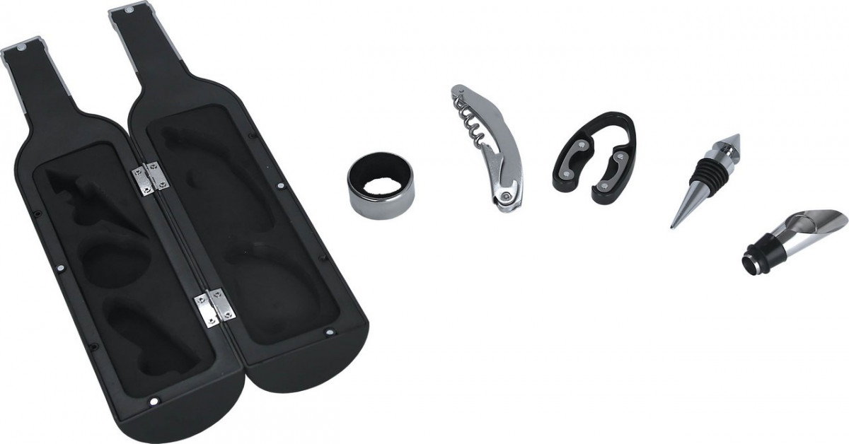 Набор барных аксессуаров из 5 предметов - незаменимый помощник в баре и кафе. Набор удобно упакован в стильный футляр в форме бутылки. Предметы входящие в набор:- 1 шт открывалка: SS 410, 11x2,8см; - 1 шт резак для фольги: 6,8x4,3 см, ABS, SS 18/0; - 1 шт винная пробка: 9x2 см, содержит цинковый сплав, алюминиевый сплав; - 1 шт винное кольцо: SS14/1, диаметр 4 см x 1,9 см в высоту; - 1 шт насадка для вина: 1,9x7,9 см, SS 18/0, содержит кремний; Аксессуары сделаны из высококачественной нержавеющей стали. Набор хранится в футляре из ABS + EVA. Профессиональный набор в стильной упаковке станет прекрасным подарком и надежным помощником за барной стойкой. Вес 550 г. Цвет: Серебристый. Размер: 7.2*7.2*32.5 см. Материал: Нержавеющая сталь; Пластик. Комплектация: Открывалка - 1 шт.; Резак для фольги - 1 шт.; Винная пробка - 1 шт.; Винное кольцо - 1 шт.; Насадка для вина - 1 шт.