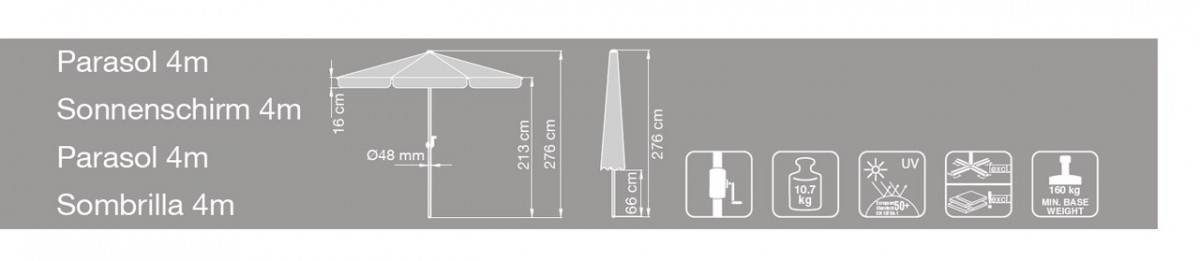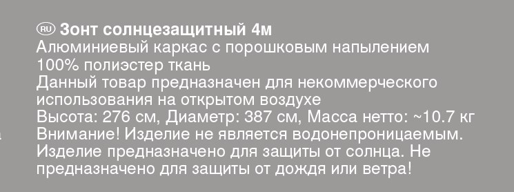Зонт 4 м станет идеальной крышей как для летнего кафе, так и для личного пользования на даче, в саду на террасе или веранде. Это идеальное средство защиты от палящего солнца. Его устанавливают между лежаками (на пляже) или столиками (в саду, летнем кафе), а устойчивость изделия зависит от качества центральной опоры. Зонт способен защитить от жары двух и более человек одновременно благодаря продуманной конструкции. Легко отстирывающийся материал купола (полиэстер) не доставит хлопот в уходе за изделием. Вес: 10.5 кг. Цвет Бежевый. Упаковка: 16*20.6*170 см. Материал: Металл; Полиэстер.