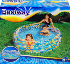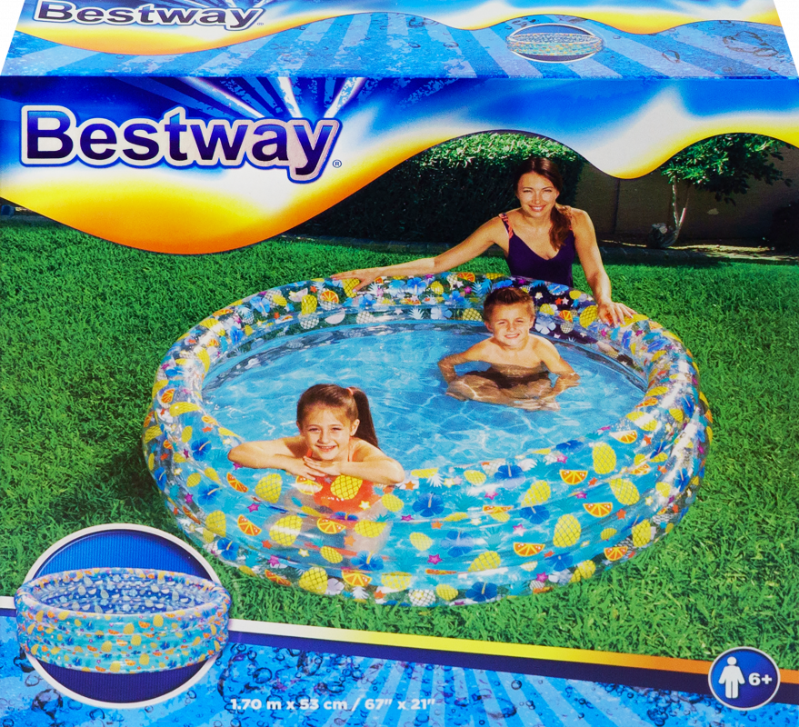 Бассейн надувной детский BESTWAY Тропический 170х53см 697л предназначен для малышей в возрасте старше 3 лет. Он прост в установке, а вода в таком бассейне быстро прогревается на солнце. Модель из плотного ПВХ устойчива к случайным проколам, истиранию и воздействию ультрафиолетовых лучей. Состав: ПВХ. Размер в упаковке: 100x380x320 мм (ДxШxВ). Возраст потребителя 3+. Тип конструкции: Надувная. Диаметр 170см. Материал: Поливинилхлорид. Цвет: Синий, зеленый, желтый. Размер бассейна 170х53см. Красочный дизайн в тропическом стиле впишется в любой дизайн. Бассейн легко сдувать и надувать.