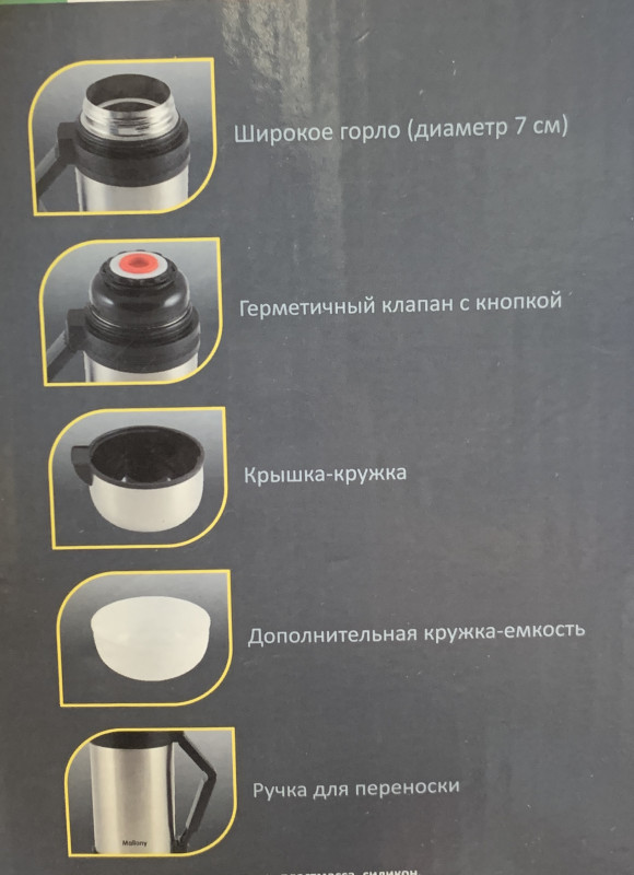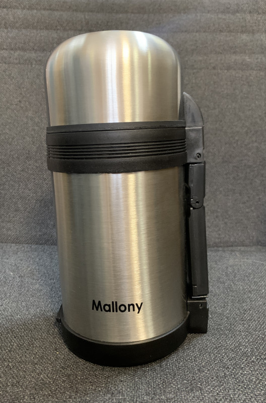 Термос MALLONY SF-1000A объемом 1л предназначен для хранения горячих и холодных жидкостей. Широкое горло (7см) позволяет хранить в нем не только напитки, но и супы. Укомплектован пробкой с кнопкой – она позволяет наливать напитки после простого нажатия, для этого не надо отвинчивать пробку. Оснащен крышкой-чашкой и дополнительной кружкой, имеет выдвижную эргономичную ручку и ремешок для переноски. Сделан из нержавеющей стали с резиновым уплотнителем. Материал Нержавеющая сталь, пластмасса, резина. Назначение Для сохранения температуры горячих и холодных напитков, супов и других жидкостей. Размер/Формат 24х12х12см.