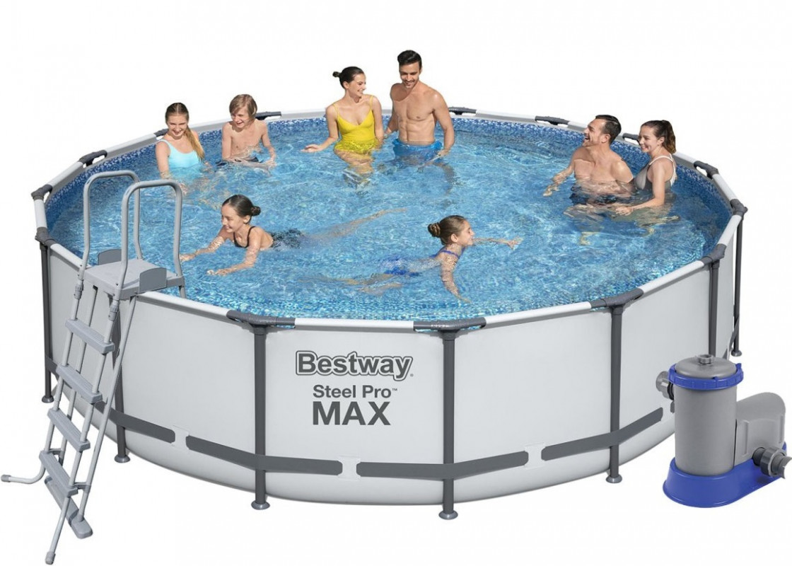 Сборный круглый каркасный бассейн Bestway 366х100 см с фильтр-насосом и лестницей. Чаша бассейна изготовлена из высококачественного трехслойного ПВХ: два слоя плотного винила и один — полиэстер для особой прочности. Для дополнительной защиты и поддержания формы используется лента из полипропилена, «опоясывающая» весь бассейн. Каркасный бассейн BESTWAY Steel Pro Max отличается высокой прочностью и устойчивостью. Чаша выполнена из высококачественного трехслойного ПВХ: два слоя плотного винила и один – полиэстер для особой прочности. Имеет металлический нержавеющий оцинкованный каркас. Не требует бетонирования и подготовки ямы. Сезонный бассейн (рекомендуется разбирать на холодное время года) обладает простой конструкцией. Время сборки и подключения – не более 2–3 часов. Размер – 366х100см. Идет в комплекте с фильтром-насосом и лестницей. Размер в упаковке: 113x44x35 см. Комплектация: Металлический каркас, чаша бассейна, фильтрационный насос, картридж, шлангии хомуты для подключения фильтр-насоса, лестница, ремкомплект. Тип конструкции: Каркасная. Диаметр 366 см. Материал: ABS-пластик, ПВХ, сталь, полипропилен, ПЭТ, полипропилен, полиэтилен, медь. Цвет: Синий. Размер: 366x366х100 см.