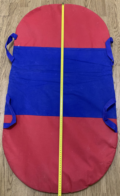 Санки двухместные выполнены из плотной ткани, внутри которых находится поролон для смягчения езды по снегу. Одна сторона: ткань. Вторая сторона выполнена из скользящей ткани, чтобы санки хорошо скользили по снегу. Форма: овальные. Материал: тентовая ткань, поролон. Размер: 117х60 см. Цвет: красный, синий. На санках расположены 4 ручки, чтобы было удобно держаться, и ледянка не выскользнула. Ледянку легко переносить, благодаря легкому весу.