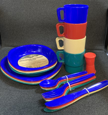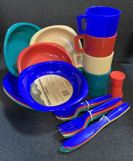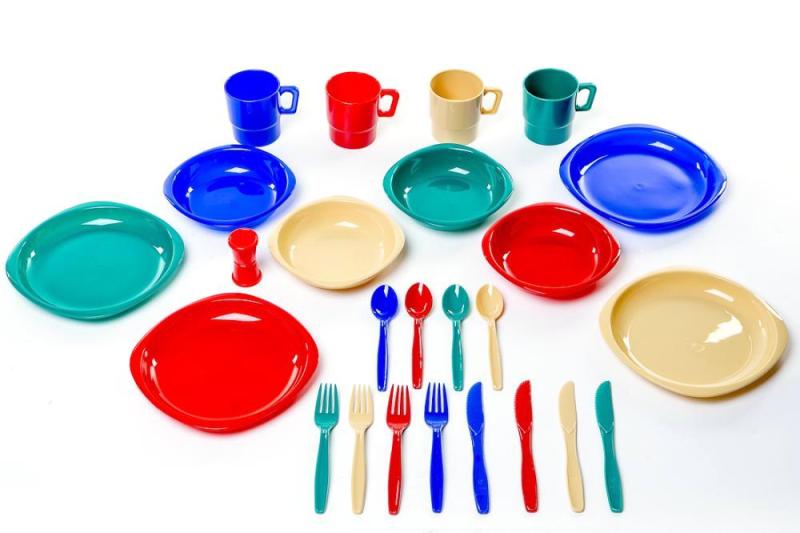 Набор пластиковой посуды Tramp (4 персоны). В наборе: 4 тарелки, 4 суповые миски, 4 кружки (230 мл), 4 комплекта столовых приборов (ложка, вилка, нож), солонка. Материал Пластик.
