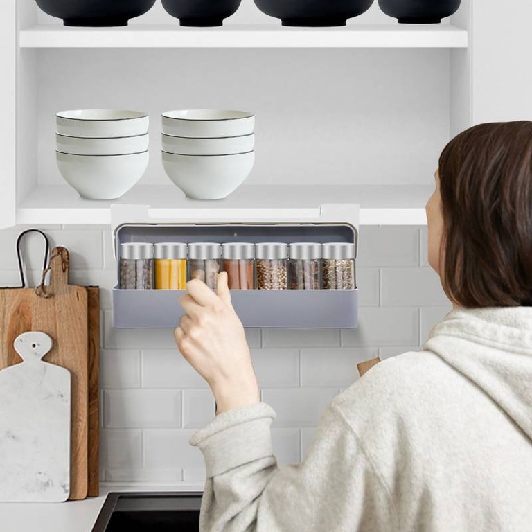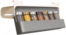 Подвесная стойка для пряностей (набор: стойка+7 стеклянных банок) Spice Organizer – вмещает 7 стеклянных банок для специй (входят в комплект). Банки выполнены из стекла и пищевой нержавеющей стали. Легко монтируется на полку шкафа.Материал: Пластик, стекло + нержавеющая сталь;Цвет: белый+серый, банки: прозрачное стекло;Размер: 32x13,5x7 см;Комплектация: Подвесная стойка для пряностей – 1 шт, банки для специй – 6 шт.
