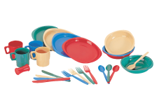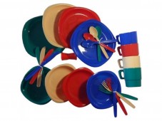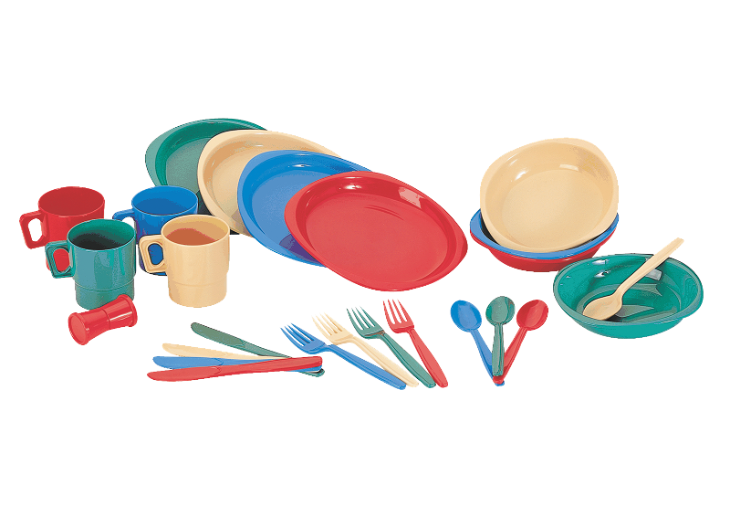 Набор пластиковой посуды Tramp (4 персоны). В наборе: 4 тарелки, 4 суповые миски, 4 кружки (230 мл), 4 комплекта столовых приборов (ложка, вилка, нож), солонка. Материал Пластик.