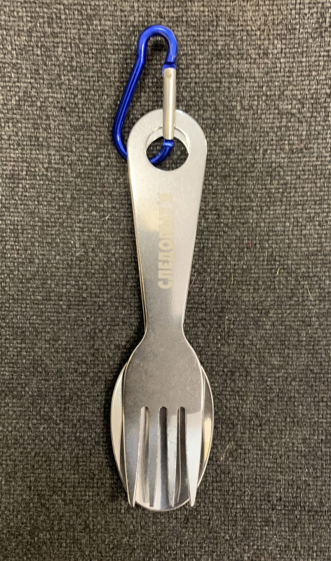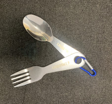 Компактный набор столовых приборов необходимых в походных условиях. Комплект: ложка, вилка, карабин. Материал: нержавеющая сталь. Длина приборов: 14 см. Вес: 76 г. В комплекте ложка, вилка-материал сталь-особенность на карабине-размеры 142х38 мм. Такой прибор, особенно, пригодится в туристическом походе, на пикнике, в дальнем путешествии. Легкий вес и маленький размер. Приборы расположены на карабине, который можно прикрепить к рюкзаку или другому аксессуару. Цвет: серебристый. Выполнен из высококачественной стали.